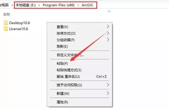 30.依次打开E盘Program Files (X86)、ArcGIS,在空白处右键选择粘贴