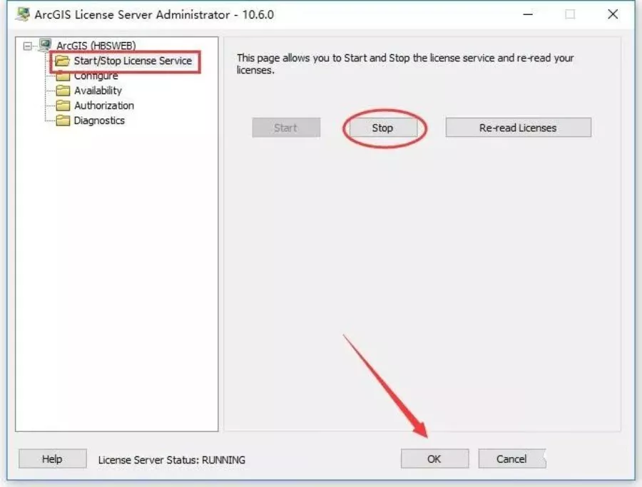 14.选择Start/Stop License Service界面,点击Stop,然后点击OK