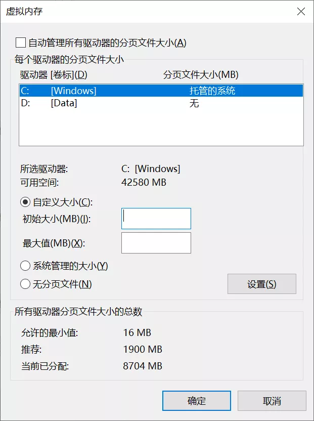 有个技术流的方法推荐给机友们——设置虚拟内存。通俗点讲,就是内存放不下的临时文件在硬盘中分割出来一部分空间存储。设置方法如图: