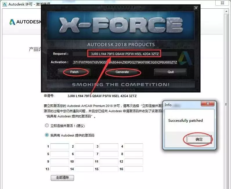 15.将软件申请号复制到注册机Request框内,点击Generate生成激活码,点击Patch打补丁,再点击确定