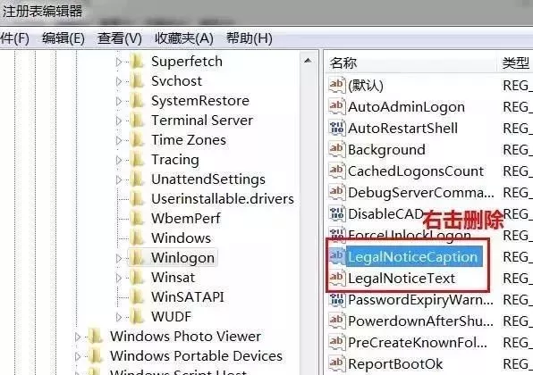 Win+R打开运行,输入regedit回车,进入注册表编辑器。依次展开:HKEY_LOCAL_MACHINE\Software\Microsoft\Windows NTCurrent VersionWinlogon,在右侧找到并右击选择删除“LegalNoticeCaption”和“LegalNoticeText”两个键值。