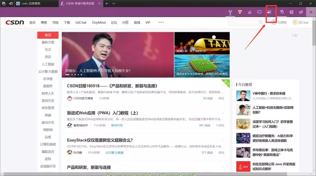 首先在Win10系统中,打开自带的Edge浏览器,然后打开需要长截屏的网页,这里以“电脑百事网”首页为例。打开网页后,点击Edge浏览器右上角的“钢笔”工具,如下图所示。