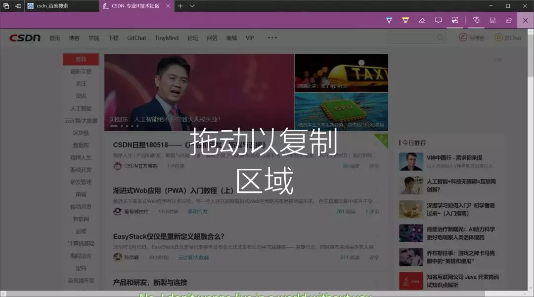 然后打开Edge浏览器添加钢笔相关工具,这里继续点击“剪辑”图标,然后将鼠标放置到要截取网页区域的左上角,按住鼠标左键一直向右下方拖动,这时你会发现,页面也可以跟随快速滚动下翻,如下图所示。