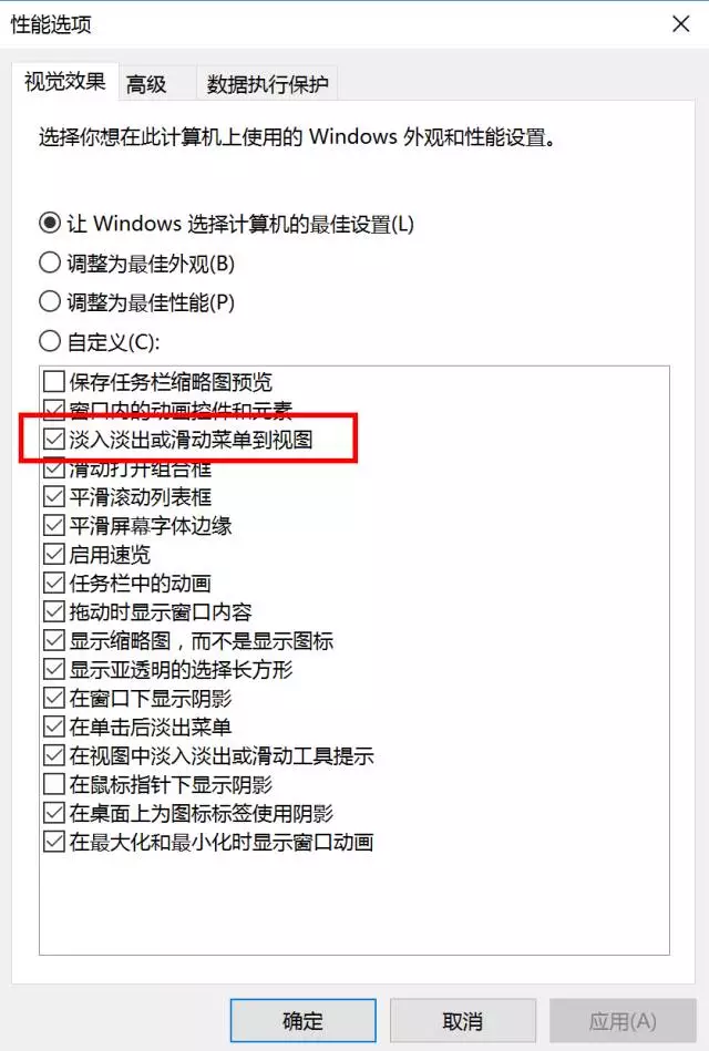 系统属性—高级—性能—设置—视觉效果-关闭淡出淡入效果。