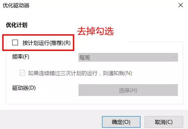 选中系统盘(通常是C盘)—属性—工具—对驱动器进行优化和碎片整理—优化—更改设置—取消选择按计划运行。