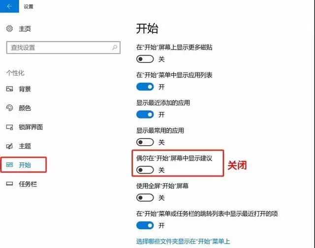 另外打开设置界面,然后选择“个性化”,在选择“开始”,在右侧栏目中,找到“偶尔在开始菜单中显示建议”选项,然后关闭即可。
