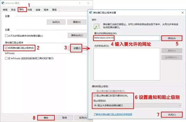 【添加】要允许的网站地址,并设置“通知和阻止级别”,完成后点击【关闭】并回到“Internet属性”窗口,点击【应用】并【确定】。