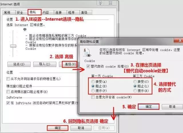 以Internet Explorer 11举例,进入IE【工具】【Internet选项】【隐私】【高级】中设置。
