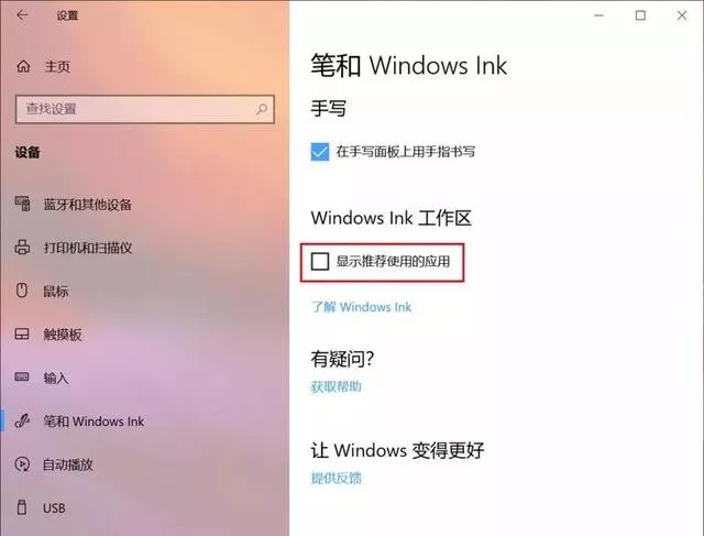 关闭方法:打开设置界面,选择“设备”,再选择“笔和Windows Ink”,在右侧找到“Windows Ink工作区”,然后取消打勾即可。