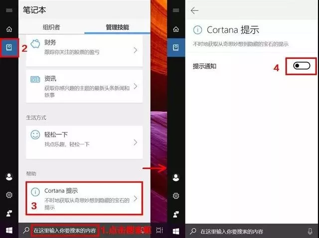 点击搜索框打开Cortana,依次点击【笔记本】【Cortana提示】,【关闭】“提示通知”。