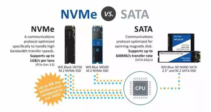 有些笔记本虽然给你预留了 M.2 接口的固态硬盘插槽,但它走的协议还是慢速的 SATA,跟 NVMe 协议比起来速度能相差好几倍。