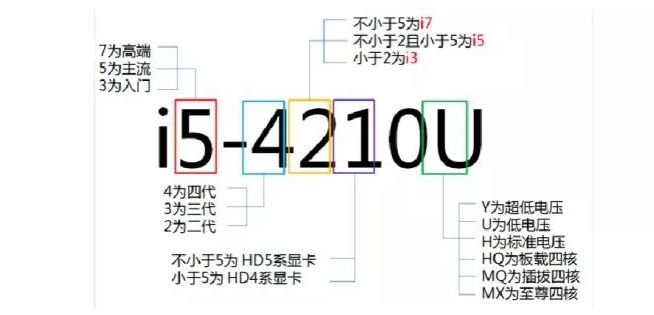 拿 Intel i7-10510U 举例,第一个数字 7 代表的是处理器的类型,第二个数字 10 代表的是它是第十代 CPU,后面 510 代表的是具体等级型号功耗。